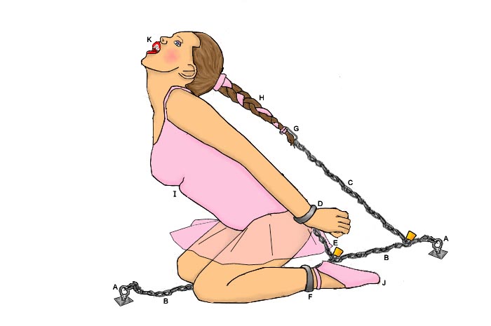 E — Цепь соединяющая наручники «D» и щиколотки манжет «F», с основной цепью «B».