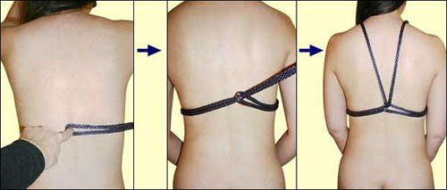 Итак, берем веревку длиною 8 – 10 метров и складываем ее пополам. С одной стороны образуется петля, а с другой два конца веревки. Оставляем петлю на спине, напротив позвоночника, а концы оборачиваем вокруг тела, пропуская под грудями, и в конце продеваем в петлю. Затем каждый из концов переводим вперед, по верх плеч, со своей стороны шеи.
