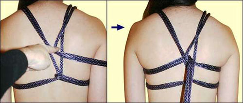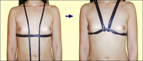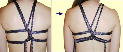 Этот стиль, который демонстрируется здесь — очень прост, легок в освоении и узнаваем. Более сложные обвязки могут иметь несколько слоев веревки, которые пересекают груди непосредственно, или вертикальные секции, которые предназначены нажимать на соски и стимулировать их.